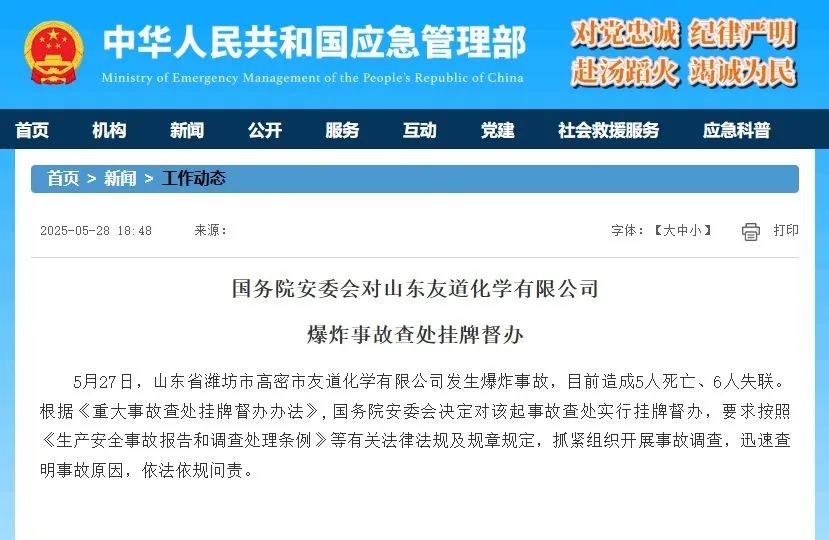 据央视新闻消息,5月27日,山东省潍坊市高密市友道化学有限公司发生爆炸事故,目前造成5人死亡、6人失联。根据《重大事故查处挂牌督办办法》,国务院安委会决定对该起事故查处实行挂牌督办,要求按照《生产安全事故报告和调查处理条例》等有关法律法规及规章规定,抓紧组织开展事故调查,迅速查明事故原因配资查询网,依法依规问责。